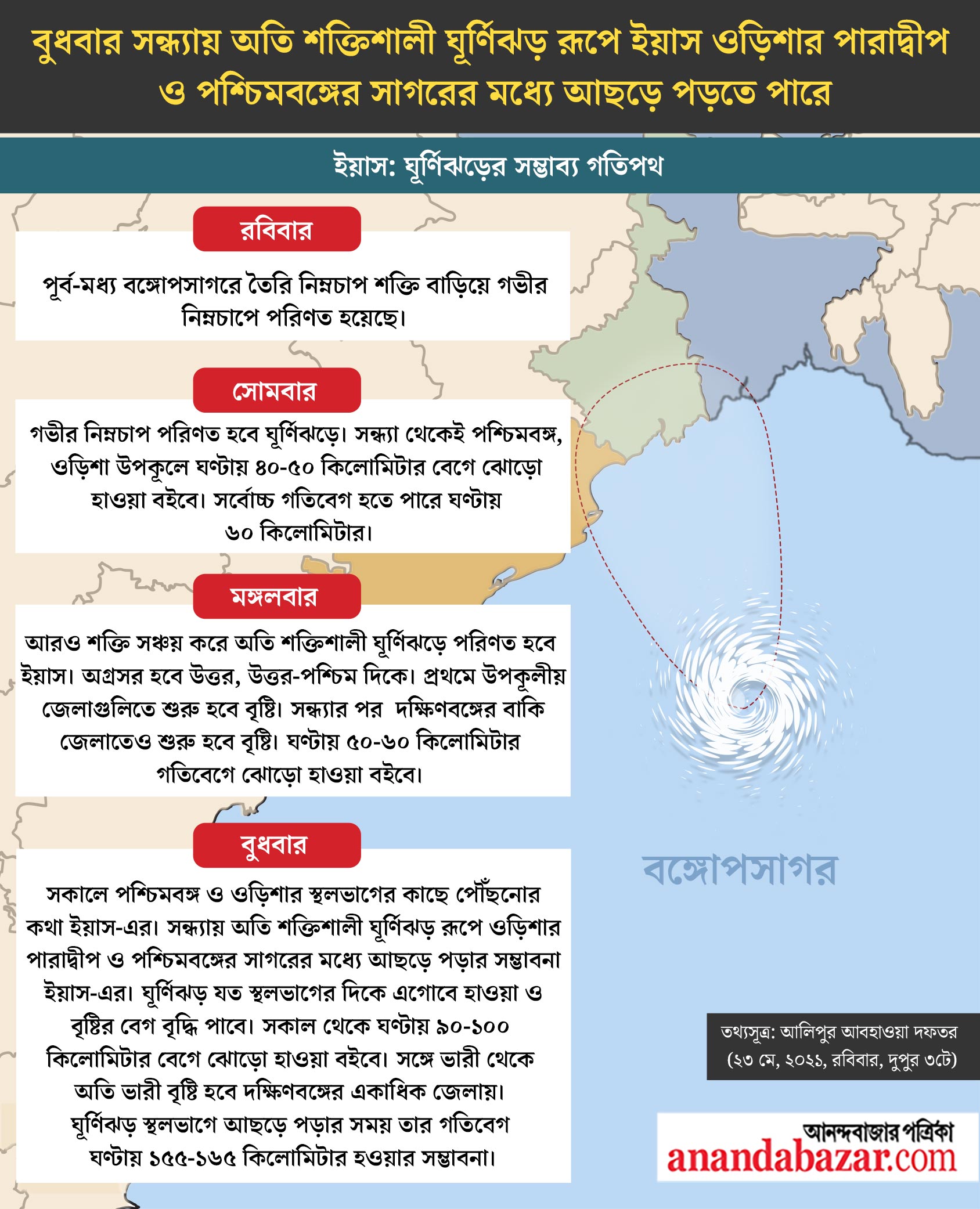 আলিপুর জানিয়েছে, বুধবার সন্ধ্যায় অতি শক্তিশালী ঘূর্ণিঝড় রূপে ইয়াস ওড়িশার পারাদ্বীপ ও পশ্চিমবঙ্গের সাগরের মধ্যে দিয়ে অতিক্রম করবে।