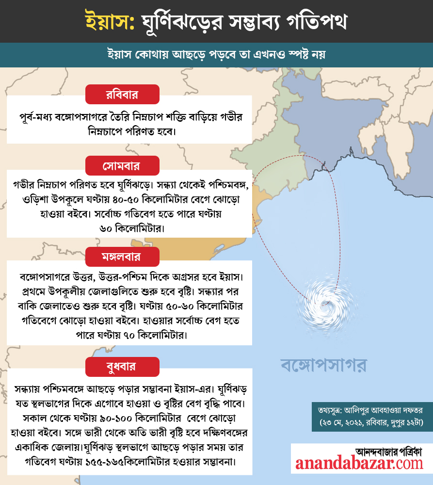 শনিবার পূর্ব-মধ্য বঙ্গোপসাগরে তৈরি নিম্নচাপ আরও শক্তি বৃদ্ধি করে রবিবার সুনির্দিষ্ট নিম্নচাপে পরিণত হয়েছে। আগামী ৪৮ ঘণ্টায় তা আরও শক্তি বাড়িয়ে প্রথমে গভীর নিম্নচাপ ও তার পর ঘূর্ণিঝড়ে পরিণত হবে বলেই পূর্বাভাস। ঘূর্ণিঝড়ে পরিণত হলে তার নাম হবে ‘ইয়াস’।