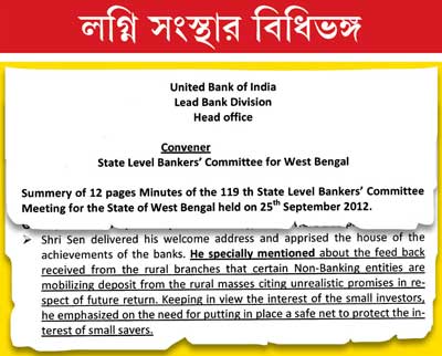 বস্তুত ব্যাঙ্ক-কর্তাদের অনেকের দাবি: রাজ্যে ক্ষুদ্র বিনিয়োগকারীদের বিরাট অংশ যে পথে বসতে চলেছেন, ভুঁইফোড় অর্থলগ্নি সংস্থার বাড়বাড়ন্ত দেখে তাঁরা তার আগাম আঁচ পেয়েছিলেন। ওঁদের বক্তব্য: ২০১১-র মে মাসে পশ্চিমবঙ্গে রাজনৈতিক পালাবদল ঘটিয়ে মমতা বন্দ্যোপাধ্যায়ের তৃণমূল যখন ক্ষমতায় এল, তার কিছু আগে থেকেই ব্যাঙ্কে-ব্যাঙ্কে গৃহস্থ-আমানতের বহর কমতে শুরু করেছে। কারণ অনুসন্ধান করতে দিয়ে ধরা পড়ে, ক্ষুদ্র বিনিয়োগকারীদের একটা বড় অংশের সামনে অবাস্তব সুদের টোপ ঝুলিয়ে টাকা তুলছে সারদা-সহ বেশ কয়েকটি অর্থলগ্নি সংস্থা। ঠিক হয়, এসএলবিসি-র বৈঠকে প্রসঙ্গটি তোলা হবে।