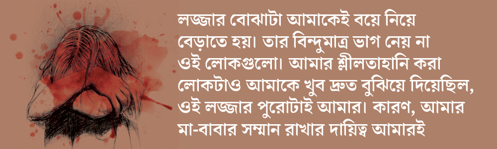 আশ্চর্যজনক ভাবে যৌন নির্যাতনের ক্ষেত্রে লজ্জা সব সময় নির্যাতিতার উপরেই বর্তায়। ১৪ বছরের আমাকে দিয়ে আমি এখনও সেটা বুঝতে পারি। লজ্জার বোঝাটা আমাকেই বয়ে নিয়ে বেড়াতে হয়। তার বিন্দুমাত্র ভাগ নেয় না ওই লোকগুলো। আমার শ্লীলতাহানি করা লোকটাও আমাকে খুব দ্রুত বুঝিয়ে দিয়েছিল, ওই লজ্জার পুরোটাই আমার। কারণ, আমার মা-বাবার সম্মান রাখার দায়িত্ব আমারই। বলেছিল, আমার কথা কেউ বিশ্বাস করবে না। তখনও ভাবতাম। এখনও ভাবি, কেন সম্মানরক্ষার দায় শুধু মেয়েদেরই। কেন পুরুষরা প্রাপ্তবয়স্ক হলেও পরিবারের সম্ভ্রম রক্ষার দায় নেবে না? এখনও উত্তর খুঁজছি এই প্রশ্নের।