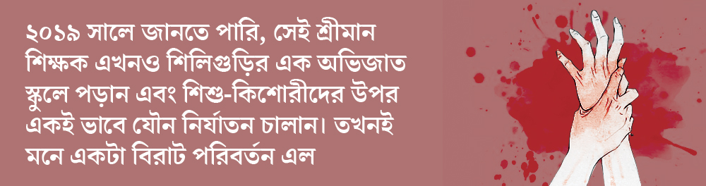কিন্তু সৃষ্টিকর্তার অন্য পরিকল্পনা ছিল। ২০১৯ সালে জানতে পারি, সেই শ্রীমান শিক্ষক এখনও শিলিগুড়ির এক অভিজাত স্কুলে পড়ান এবং শিশু-কিশোরীদের উপর একই ভাবে যৌন নির্যাতন চালান। তখনই মনে একটা বিরাট পরিবর্তন এল। মনে হল, যৌনশিকারির হাত থেকে বেঁচে গেলেও জীবনভর যে যন্ত্রণা বয়ে বেড়াচ্ছি, তা যেন অন্য কারও সঙ্গে না হয়। যে লোকটার জন্য আমি আমার এই কষ্ট বয়ে নিয়ে চলেছি, তা যেন অন্য কোনও মেয়ের ক্ষেত্রে না হয়। আমার বিবেক তাতে সায় দেবে না।
