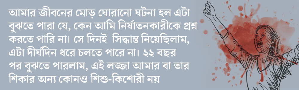 অভিযোগ জানানোর পরেও লড়াইটা সহজ ছিল না। জানতাম, এ সব ঘটনা প্রমাণ করা কতটা কঠিন! কারণ, এই ধরনের সব অপরাধই ঘটে লুকিয়ে-চুরিয়ে। শুধু চার দেওয়ালের মধ্যেই নয়, শিক্ষক-ছাত্রী, কাকা-ভাইঝি, দাদু-নাতনি এমনকি, বাবা-মেয়ের মতো পবিত্র ও সম্মানের সম্পর্কের আড়ালেও। রক্ষকই ভক্ষক হয়ে ওঠে। পরিবারের সম্মানের বোঝা মাথায় নিয়ে চলা ওই নির্যাতিতাদের বয়ে বেড়াতে হয় সারাজীবনের যন্ত্রণা। প্রশ্নের মুখে পড়তে হয় না বিশ্বাসঘাতকদের।