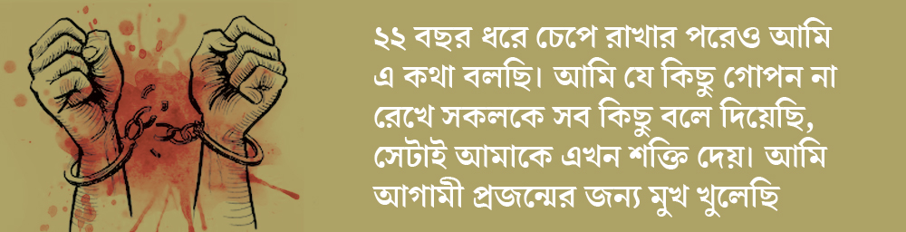 সময় যত এগিয়েছে, ভেবেছি সেই লজ্জা হয়তো লুকোতে পেরেছি। কিন্তু বুঝতে পারিনি, সেই যন্ত্রণা চেপে রেখে দিনের পর দিন যন্ত্রণাটা আরও বাড়িয়ে গিয়েছি। যত লুকোনোর চেষ্টা করেছি, ততই সেই ফ্ল্যাশব্যাক আর দুঃস্বপ্ন বহন করেছি। যত পালাতে চেয়েছি, তত মনের পর্দায় ভেসে উঠেছে সেই শয়তানটার ছবি, তার শক্ত হাতের থাবা আর মুখের কুটিল ভঙ্গি। তখন বুঝতে পারিনি, সেই যন্ত্রণা থেকে মুক্তির একমাত্র উপায় ছিল সেই লজ্জার সঙ্গে যুদ্ধ করা এবং লোকটার মাথা হেঁট করিয়ে দেওয়া।