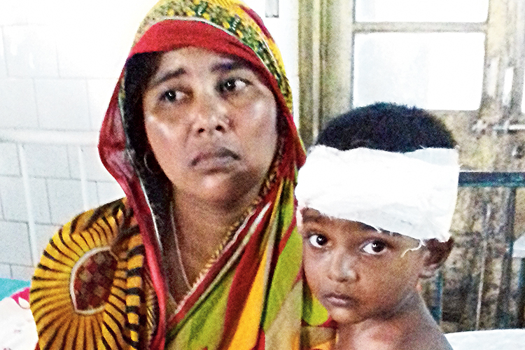 গোপালপুরে বোমাবাজিতে জখম খুদে। মায়ের সঙ্গে মালদহ মেডিক্যালে। নিজস্ব চিত্র।
