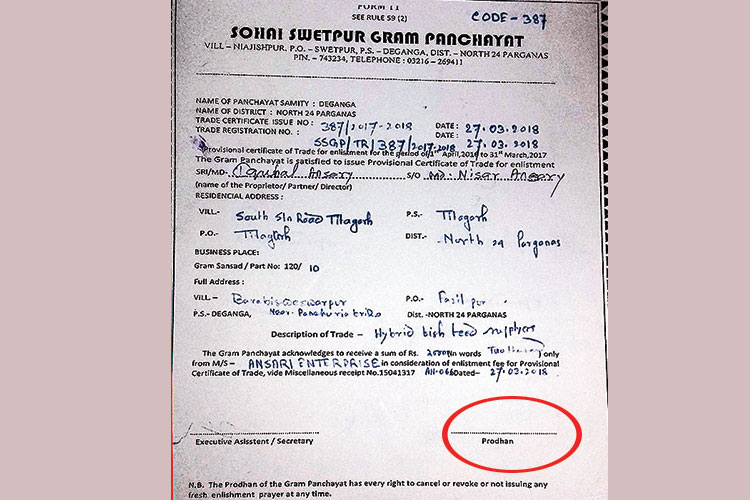 ছাড়পত্রে নেই পঞ্চায়েত প্রধানের সই (চিহ্নিত)। ছবি: সজলকুমার চট্টোপাধ্যায়