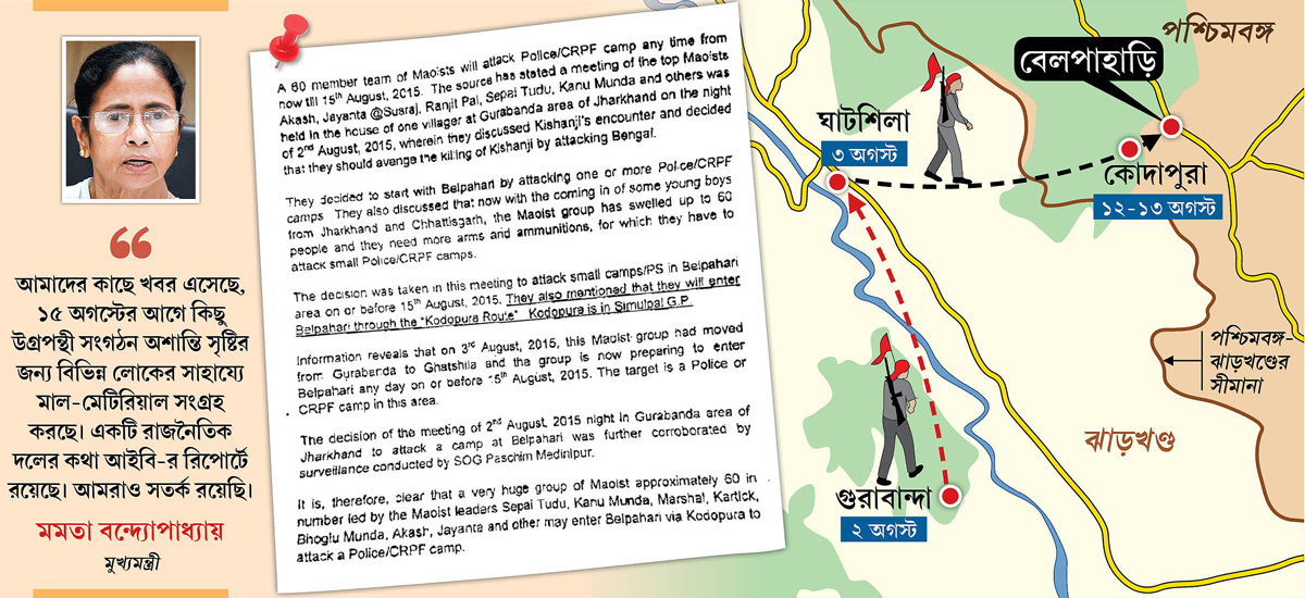 নবান্ন সূত্রের খবর, কেন্দ্রের ওই সতর্কবার্তায় বলা হয়েছে, মাওবাদীদের ৬০ জনের একটি দল জঙ্গলমহলে ঢোকার অপেক্ষায় রয়েছে। তারা ১৫ অগস্টের মধ্যে যে কোনও সময়ে জঙ্গলমহলের কোনও পুলিশ বা সিআরপি ক্যাম্পে হামলা চালাতে পারে। কেন্দ্রীয় গোয়েন্দারা নির্দিষ্ট ‘সোর্স’ মারফত জেনেছেন, গত ২ অগস্ট রাতে ঝাড়খণ্ডের গুরাবান্দা গ্রামে এক গ্রামবাসীর বাড়িতে মাওবাদীরা জঙ্গলমহল আক্রমণের কৌশল ঠিক করতে বৈঠক করে। সেই বৈঠকে আকাশ, জয়ন্ত ওরফে সুসরাজ, রঞ্জিত পাল, সেপাই টুডু, কানু টুডুরা হাজির ছিলেন। সেখানেই মাওবাদী নেতৃত্ব সিদ্ধান্ত নেন, কিষেনজির মৃত্যুর বদলা নিতে এ বার বাংলাতেই বড় ধরনের হামলা চালাবেন তাঁরা। ঠিক হয়, প্রথম নিশানা হবে বেলপাহাড়ি। এ জন্য তাঁরা ঝাড়খণ্ড থেকে বেলপাহাড়ির কোদাপুরা দিয়ে বাংলায় ঢুকবে। কোদাপুরা বেলপাহাড়ির শিমুলপাল গ্রাম পঞ্চায়েতের অধীনে পড়ে। কেন্দ্রের বার্তা থেকে জানা গিয়েছে, ৩ অগস্ট গুরাবান্দা থেকে ৬০ জনের ওই দলটি পশ্চিমবঙ্গ লাগোয়া ঘাটশিলায় এসে পৌঁছয়। যে কোনও সময় তারা বেলপাহাড়িতে ঢুকে পড়তে পারে।