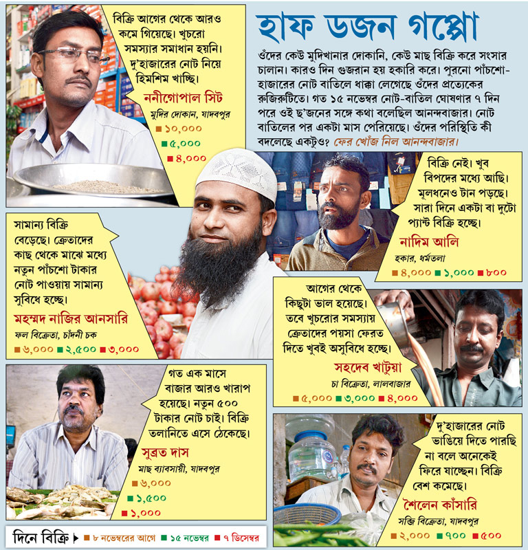 ওঁদের কেউ মুদিখানার দোকানি, কেউ মাছ বিক্রি করে সংসার চালান। কারও দিন গুজরান হয় হকারি করে। পুরনো পাঁচশো-হাজারের নোট বাতিলে ধাক্কা লেগেছে ওঁদের প্রত্যেকের রুজিরুটিতে। গত ১৫ নভেম্বর নোট-বাতিল ঘোষণার ৭ দিন পরে ওই ছ’জনের সঙ্গে কথা বলেছিল আনন্দবাজার। নোট বাতিলের পর একটা মাস পেরিয়েছে। ওঁদের পরিস্থিতি কী বদলেছে একটুও? ফের খোঁজ নিল আনন্দবাজার।