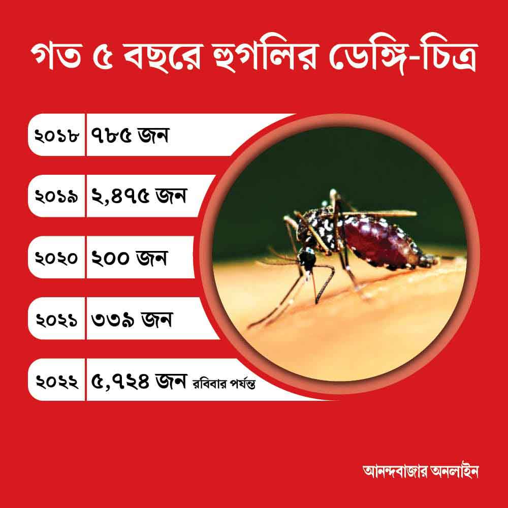 রাজ্যে ডেঙ্গি পরিস্থিতিতে আশঙ্কা জাগাচ্ছে হুগলি। জেলার স্বাস্থ্য দফতরের পরিসংখ্যান জানিয়েছে, গত ৫ বছরের মধ্যে চলতি বছর হুগলিতে সবচেয়ে বেশি আক্রান্তের সন্ধান পাওয়া গিয়েছে। এখনও পর্যন্ত এ জেলায় আক্রান্তের সংখ্যা ৫,৭২৪ জন। যে সব জায়গায় ডেঙ্গির প্রকোপ বাড়ছে, সেই এলাকার বাসিন্দাদের অতি সতর্ক থাকার পরামর্শ দিয়েছে স্বাস্থ্য দফতর।