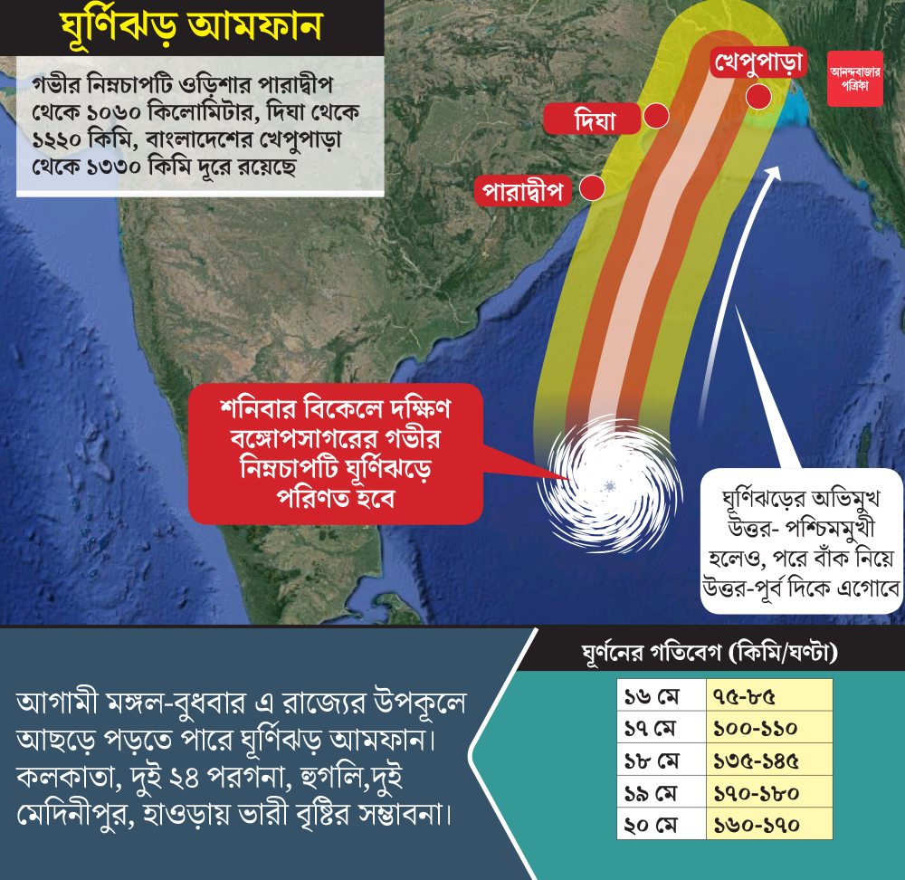 দক্ষিণ বঙ্গোপসাগরের গভীর নিম্নচাপটি আজ, শনিবার ঘূর্ণিঝড়ে পরিণত হল। ২৪ ঘণ্টার মধ্যেই ভয়ঙ্কর ঘূর্ণিঝড়ের চেহারা নিতে চলেছে। তাইল্যান্ড ওই ঘূর্ণিঝড়ের নাম দিয়েছে ‘আমফান’। প্রথমে ঘূর্ণিঝড়ের অভিমুখ উত্তরমুখী হলেও, পরে বাঁক নিয়ে তা উত্তর-পূর্ব দিকে ধীরে ধীরে এগোবে। এখনও পর্যন্ত যা গতিপ্রকৃতি, তাতে মঙ্গল-বুধবার এ রাজ্যের উপকূলে ‘আমফান’-এর আছড়ে পড়ার সম্ভাবনা রয়েছে।
