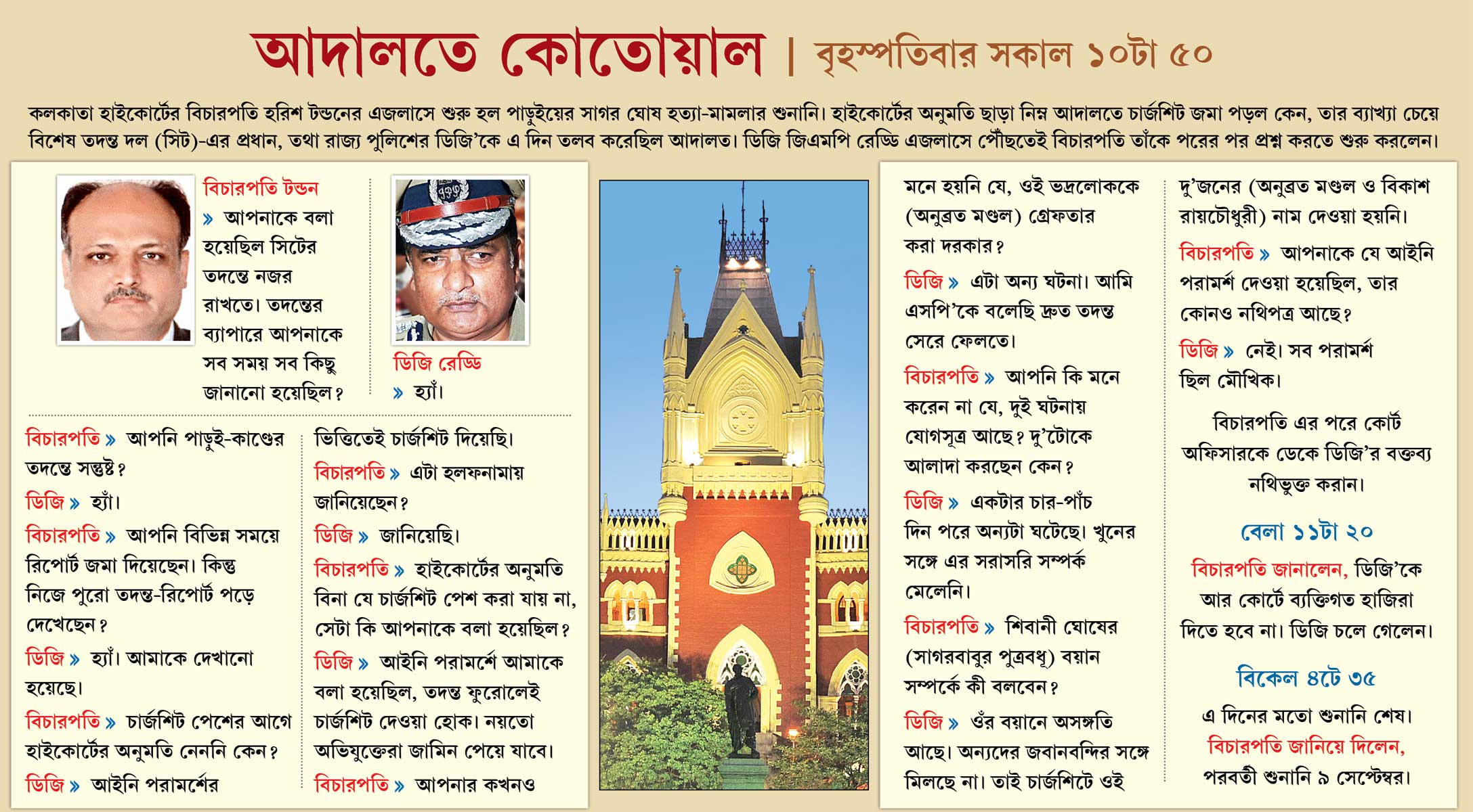 ডিজি জি এম প্রভু রাজাশেখর রেড্ডি এ সব মন্তব্যের জবাব দিতে চাননি। কেন তিনি অনুব্রতকে আড়াল করলেন, সেই প্রশ্নে ডিজি-র জবাব, “বিষয়টি আদালতের বিচারাধীন। তাই আমি এ ব্যাপারে মন্তব্য করব না।”