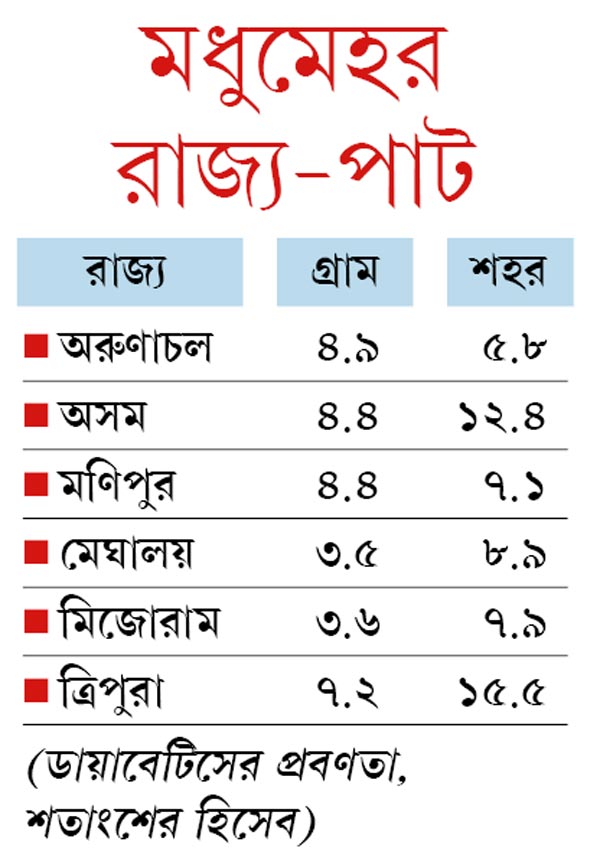 ‘‘ত্রিপুরা ও পশ্চিমবঙ্গের মানুষের খাদ্যাভাস, শারীরিক গঠন, আচার-ব্যবহার সবই প্রায় এক রকম। তাই আইসিএমআর-এর সমীক্ষায় ত্রিপুরায় যে-ফল মিলেছে, তা থেকে পশ্চিমবঙ্গ সম্পর্কে একটা ধারণা করা যেতেই পারে,’’ বলছেন কলকাতার ইনস্টিটিউট অব পোস্ট গ্র্যাজুয়েট মেডিক্যাল এডুকেশন অ্যান্ড রিসার্চ (আইপিজিএমইআর)-এর সঙ্গে যুক্ত এন্ডোক্রিনোলজিস্ট সতীনাথ মুখোপাধ্যায়। আইসিএমআর-এর প্রাথমিক সমীক্ষার ফল দেখে সতীনাথবাবুর প্রতিক্রিয়া, যে-মানুষটি গ্রামে রোজ কয়েক কিলোমিটার হাঁটতেন বা সাইকেলে ঘুরতেন, শহরে এসে সামান্য দূরত্বে যেতেও তিনি বাস বা অটো ব্যবহার করছেন। অথবা স্কুটার বা বাইক ব্যবহার করছেন। ফলে তাঁর কায়িক পরিশ্রমটাই আর হচ্ছে না। তার সঙ্গে যোগ হয়েছে শহুরে খাবার। ‘‘দুইয়ে মিলে ডায়াবেটিসের জাঁকিয়ে বসাটাই স্বাভাবিক,’’ মন্তব্য সতীনাথবাবুর।