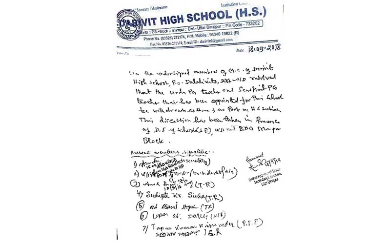 দাড়িভিট স্কুলের সেই লিখিত প্রতিশ্রুতি। যেখানে বলা হয়েছিল উর্দু এবং সংস্কৃতের শিক্ষক নেওয়া হবে না।