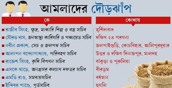 লালগড় আন্দোলনের গোড়ায় বাসিন্দাদের মন বুঝতে জঙ্গলমহলে আইএএস-দের পাঠিয়েছিলেন তৎকালীন মুখ্যমন্ত্রী বুদ্ধদেব ভট্টাচার্য। সেই আমলাদের রিপোর্ট বাস্তবায়নের আগেই অবশ্য মাওবাদীরা গোটা জঙ্গলমহল কব্জা করে ফেলে। ফলে রিপোর্টটি ফাইলবন্দি থেকে যায়। এ বার পরিস্থিতি সামাল দিতে ধানি জেলাগুলিতে পাঠানো হচ্ছে সচিবদের। নবান্নের এক কর্তার বক্তব্য, খাদ্যসাথী প্রকল্পে দু’টাকা কেজি দরে চাল দিতে সরকার বদ্ধপরিকর। কার্যত এই প্রকল্পের দাপটেই গত বিধানসভা ভোটে ধরাশায়ী হয়েছে বিরোধী শিবির। একমাত্র খাদ্যসাথীকে সামনে রেখেই সরকার রেড রোডে অনুষ্ঠান করে। ‘‘সেই প্রকল্প বছরের গোড়াতেই গোত্তা খাওয়ায় ক্রমশই চিন্তা বাড়ছে,’’ বলেন ওই নবান্ন-কর্তা।