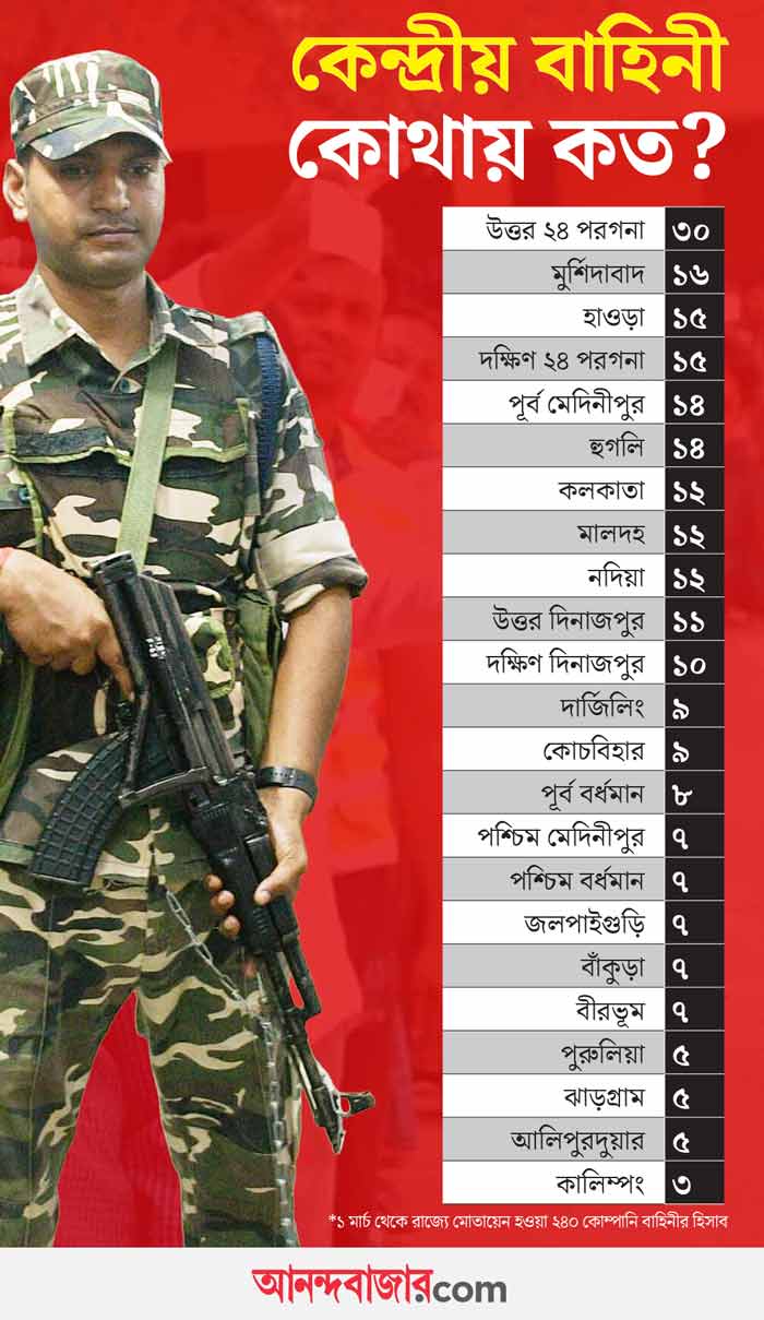 দার্জিলিঙের পার্বত্য এলাকা এবং শিলিগুড়ি মিলিয়ে ৯ কোম্পানি বাহিনী মোতায়েন করা হচ্ছে। কোচবিহারেও মোতায়েন হচ্ছে ৯ কোম্পানি। পূর্ব বর্ধমানে নামানো হচ্ছে ৮ কোম্পানি। এ ছাড়া বাঁকুড়া, বীরভূম, পশ্চিম বর্ধমান, পশ্চিম মেদিনীপুর এবং জলপাইগুড়িতে ৭ কোম্পানি করে, পুরুলিয়া, ঝাড়গ্রাম এবং আলিপুরদুয়ারে ৫ কোম্পানি করে এবং কালিম্পঙে ৩ কোম্পানি কেন্দ্রীয় বাহিনী মোতায়েন করছে নির্বাচন কমিশন।