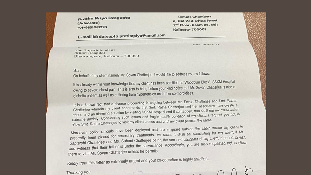চিঠিতে শোভনের আইনজীবী লিখেছেন, শোভন-রত্নার বিবাহবিচ্ছেদের মামলা এখনও চলছে। এই পরিস্থিতিতে স্ত্রী রত্নাকে হাসপাতালে তাঁর কেবিনে ঢুকতে দিলে অশান্তির ঘটনা ঘটতে পারে। তাতে তাঁর শারীরিক অবস্থার অবনতি হতে পারে, এমনটাই আশঙ্কা করছেন শোভন। এই প্রসঙ্গে শোভনের আইনজীবী জানান, সোমবার রাতে জেলে থাকাকালীন বুকে ব্যথা অনুভব করায় মঙ্গলবার তাঁর মক্কেলকে হাসপাতালে ভর্তি করা হয়েছে। তা ছাড়াও ডায়াবিটিসে ভুগছেন তিনি। উচ্চ রক্তচাপের সমস্যাও রয়েছে। তবে ছেলে সপ্তর্ষি এবং মেয়ে সুহানিকে তাঁর কেবিনের কাছে আসতে না দেওয়ার অনুরোধের কারণ হিসাবে প্রতিমপ্রিয় জানান, শোভনের কেবিনের বাইরে ইতিমধ্যেই পুলিশ মোতায়েন করা হয়েছে। বাবা পুলিশি নজরদারিতে রয়েছে, তা সপ্তর্ষি এবং সুহানি দেখলে তাঁদের কাছে শোভনের ভাবমূর্তি নষ্ট হতে পারে। সে কারণেই ‘নিষেধ’। চিঠির শেষে এসএসকেএম-এর সুপারকে বিষয়টিকে গুরুত্ব দিয়ে দেখার আবেদন জানানো হয়েছে।