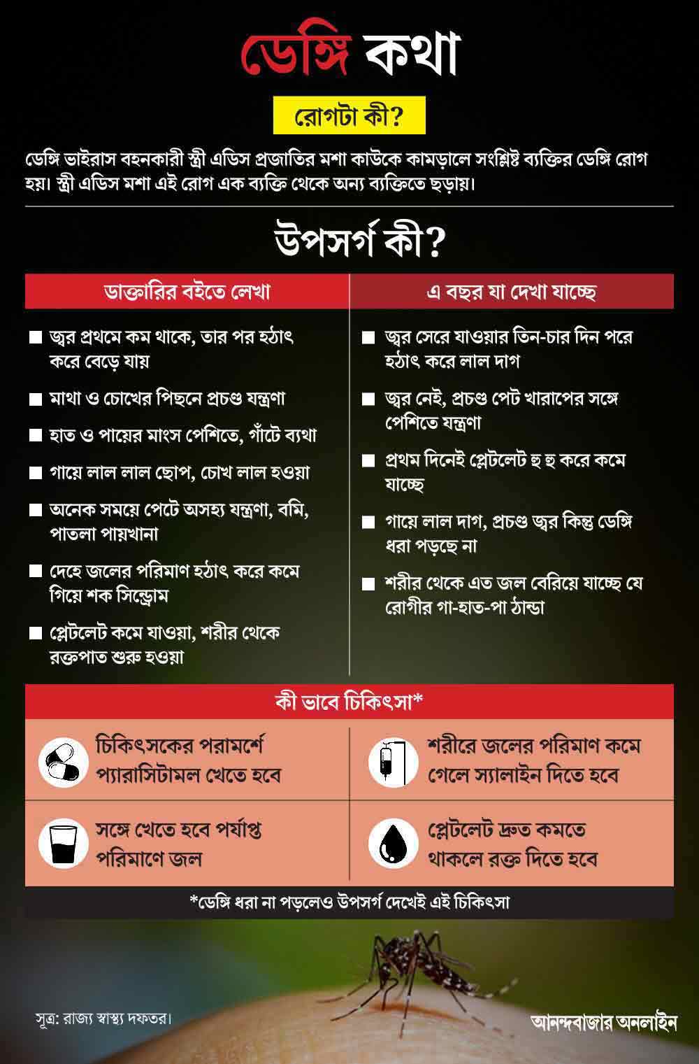 চিকিৎসকদের দাবি, ডেঙ্গি আক্রান্ত হওয়ার ৪-৫ দিনের মধ্যে পরিস্থিতি হাতের বাইরে চলে যাচ্ছে। এক চিকিৎসকের মন্তব্য, ‘‘এমন অভিজ্ঞতা আগে কখনও হয়নি। আমাদের কে যে বোকা বানাচ্ছে তা-ই বুঝতে পারছি না। এ বারে সংক্রমণের হার ২০১৩-১৪-র কাছাকাছি থাকলেও, ভয় দেখাচ্ছে ডেঙ্গির নিত্যনতুন উপসর্গ। অনেক ক্ষেত্রেই রোগীকে যখন চিকিৎসকের কাছে নিয়ে যাওয়া হচ্ছে, তত ক্ষণে তাঁর মাল্টিঅর্গান ফেলিওর শুরু হয়ে গিয়েছে।’’
