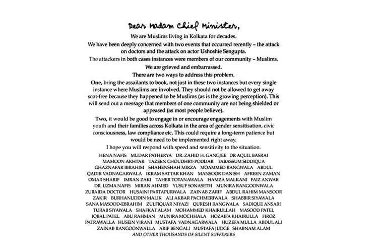 ‘দু’টি ঘটনার হামলাকারীরা মুসলিম— তাতে আমরা ব্যথিত এবং লজ্জিত’— এ কথা বলে চিঠিতে মুখ্যমন্ত্রীকে লেখা হয়েছে, ‘প্রথমত দোষীদের আইনি সাজা দিন। মুসলিমরা জড়িত, এমন সব ঘটনাতেই তেমনটা করুন। মুসলিম বলে তারা যেন কখনওই রেহাই না-পায় (লোকে ইদানীং যা ভাবছে)। তাতে একটা বার্তা যাবে, একটি গোষ্ঠীকে আড়াল করা হচ্ছে না (যা বেশির ভাগ লোকের বিশ্বাস)।’ এ-সবই হাজারো ‘নিঃশব্দ ভুক্তভোগীর’ কথা বলে চিঠিতে দাবি করা হয়েছে।