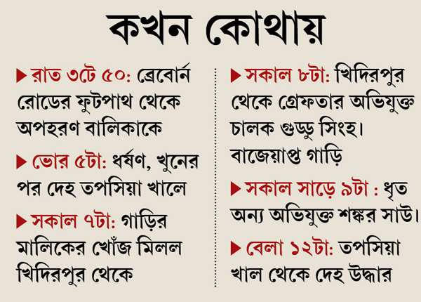 খাস কলকাতার ব্রেবোর্ন রোডের ফুটপাথ থেকে ঘুমন্ত সেই মেয়েকে তুলে নিয়ে গিয়ে একাধিক বার ধর্ষণ করা হল চলন্ত গাড়িতে। তার পর গলা টিপে মেরে দেহটা ছুড়ে ফেলা হল খালের জলে। গাড়ির নম্বরের সূত্র ধরে বুধবার সকালে দুই অভিযুক্তের বাড়িতে যখন হানা দিচ্ছে পুলিশ, তারা তখন নিশ্চিন্তে ঘুমোচ্ছিল। নির্বিকার মুখে দু’জনে পুলিশকে দেখিয়ে দিয়েছে, তপসিয়ার খালের ঠিক কোথায় ‘বডিটা’ ছুড়ে ফেলেছিল তারা।