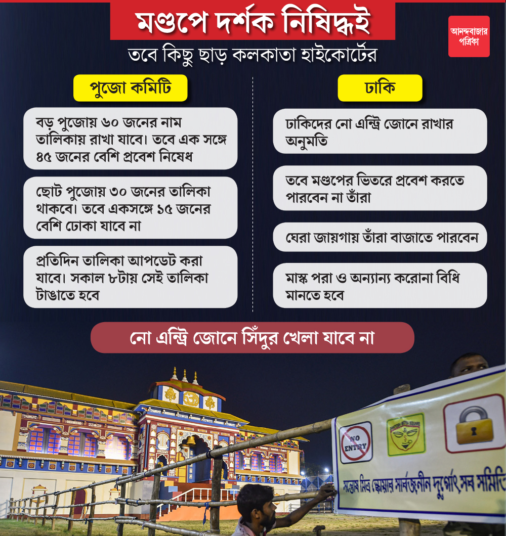 কলকাতা হাইকোর্টের বিচারপতি সঞ্জীব বন্দ্যোপাধ্যায় ও বিচারপতি অরিজিৎ বন্দ্যোপাধ্যায়ের বেঞ্চের রায় ছিল ছোট পুজোর ক্ষেত্রে সর্বোচ্চ ১৫ জন এবং বড় পুজোর ক্ষেত্রে সর্বোচ্চ ২৫ জন পুজোর জন্য ‘নো এন্ট্রি জোন’-এ ঢুকতে পারবেন। দর্শকদের ওই এলাকায় ঢোকা নিষিদ্ধ। সেই রায় পুনর্বিবেচনার আর্জি জানায় ‘ফোরাম ফর দুর্গোৎসব কমিটি’। বুধবার শুনানির দু’টি ক্ষেত্রে সামান্য ছাড় দিয়ে কার্যত আগের রায়ই বহাল রেখেছেন দুই বিচারপতি।