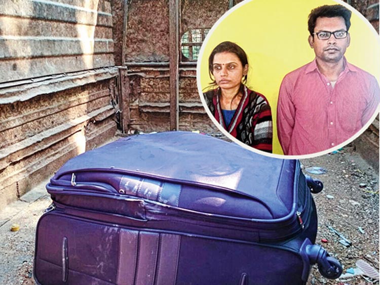 এই ব্যাগেই মিলেছিল শিল্পার দেহ। ইনসেটে, ধৃত দম্পতি। ছবি: বিকাশ মশান।