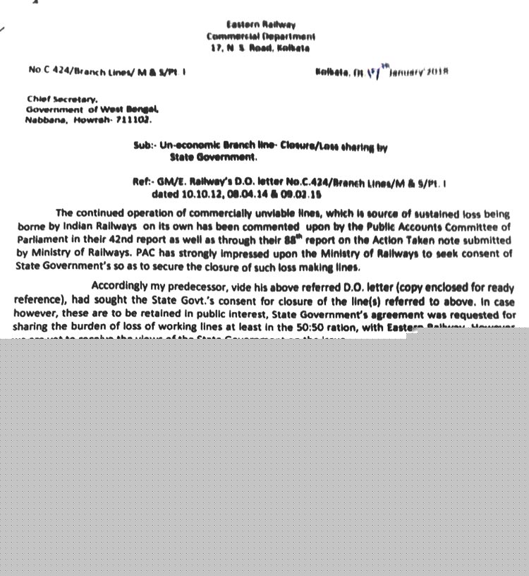 রাজ্যের মুখ্যসচিব মলয় দে’কে লেখা পূর্ব রেলের চিঠিতে বলা হয়েছে, পাবলিক অ্যাকাউন্টস কমিটি তাদের ৪২তম রিপোর্টে লোকসানে চলা লাইনগুলি বন্ধ করার ব্যাপারে রাজ্যগুলির সম্মতি আদায়ের উপরে জোর দিতে বলেছে। সেই মতো এর আগে রাজ্যকে চিঠি পাঠিয়ে লোকসানে চলা এই সব লাইন বন্ধ করার ব্যাপারে সম্মতি চাওয়া হয়েছিল। একই সঙ্গে এ-ও বলা হয়েছিল যে, জনস্বার্থে এই সব লাইন চালাতে হলে লোকসানের অন্তত অর্ধেক পূর্ব রেলের সঙ্গে ভাগ করে নিতে হবে। কিন্তু রাজ্যের তরফ থেকে এখনও কিছু জানানো হয়নি।