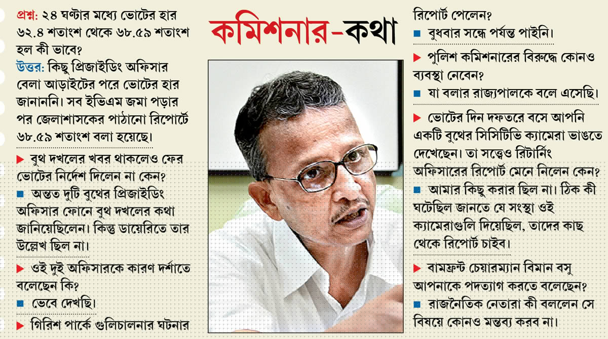কেন নির্বাচন কমিশনকে রিপোর্ট পাঠানো হল না? এ দিন রাতে সেই প্রশ্নের উত্তর পেতে নগরপাল সুরজিৎ কর পুরকায়স্থ এবং যুগ্ম কমিশনার (সদর) রাজীব মিশ্রকে প্রথমে ফোন এবং পরে এসএমএস করা হলেও তার কোনও উত্তর পাওয়া যায়নি। কলকাতা পুরভোটের রিটার্নিং অফিসার ও দক্ষিণ ২৪ পরগনার জেলাশাসক শান্তনু বসু আগেই জানিয়েছেন, ওই ঘটনার রিপোর্ট কমিশনকে দেওয়ার দায় লালবাজারের, তার নয়।