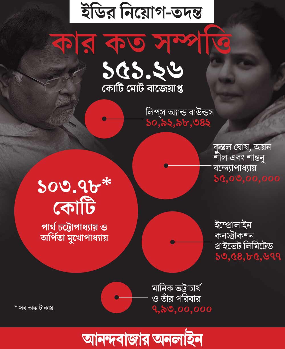 নিয়োগ দুর্নীতি মামলার তদন্তে ২০২২ সালের ২২ জুলাই দক্ষিণ কলকাতার নাকতলায় পার্থের বাড়িতে অভিযান চালিয়েছিল ইডি। দীর্ঘ তল্লাশি এবং জিজ্ঞাসাবাদের পর গ্রেফতার করা হয়েছিল তাঁকে। একই সঙ্গে অর্পিতার টালিগঞ্জ এবং বেলঘরিয়ার ফ্ল্যাটেও কেন্দ্রীয় তদন্তকারী সংস্থা হানা দিয়েছিল। ইডি জানায়, টালিগঞ্জের একটি আবাসনে অর্পিতার ফ্ল্যাট থেকে নগদ ২১ কোটি ৯০ লক্ষ টাকা উদ্ধার করেছিল তারা। একই সঙ্গে উদ্ধার হয় প্রচুর বিদেশি মুদ্রা এবং সোনার গয়নাও। এর পরে ওই বছরেরই ২৭ জুলাই বেলঘরিয়ার একটি আবাসনে অর্পিতার নামে থাকা দু’টি ফ্ল্যাট থেকেও মোট ২৭ কোটি ৯০ লক্ষ টাকা নগদে উদ্ধার করে ইডি। সঙ্গে প্রচুর টাকার গয়নাও। ইডির দাবি, অর্পিতার দু’টি ফ্ল্যাট থেকে নগদে মোট ৪৯ কোটি ৮০ লাখ টাকা এবং ৫ কোটি ৮ লাখ টাকার গয়না উদ্ধার হয়েছিল। শুধু তা-ই নয়, এ ছাড়াও এই দু’জন দুর্নীতির মাধ্যমে ‘উপার্জন’ করেছেন ৪৮ কোটি ৯০ লক্ষ টাকা। অর্থাৎ পার্থ ও অর্পিতার মিলিয়ে এই মামলায় ১০৩ কোটি ৭৮ লক্ষ টাকার সম্পত্তি এবং নগদ বাজেয়াপ্ত করা হয়েছে। উল্লেখ্য, সম্প্রতি অর্পিতার জামিনের আবেদন মঞ্জুর হওয়ায় তিনি এখন জেলমুক্ত। এই মামলায় সুপ্রিম কোর্ট থেকে জামিন পেয়েছেন পার্থও। তবে তাঁর জেলমুক্তির আগেই শীর্ষ আদালতের নির্দেশে নিম্ন আদালতে চার্জ গঠন প্রক্রিয়া শুরু হয়েছে।