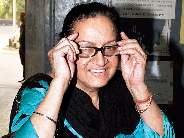 ইডি-র দফতের হাজির রমেশ গাঁধীর স্ত্রী কিরণ। শুক্রবার। — নিজস্ব চিত্র।