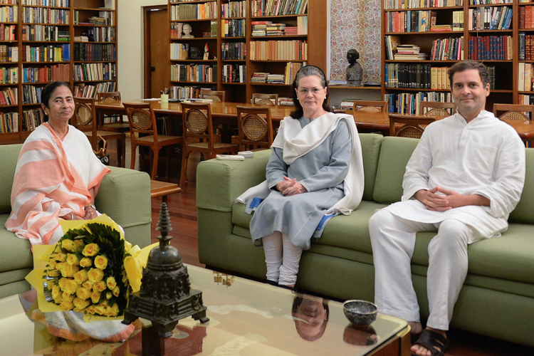 সনিয়া গাঁধী এবং রাহুল গাঁধীর সঙ্গে মমতা বন্দ্যোপাধ্যায়। নয়াদিল্লিতে। —ফাইল চিত্র।