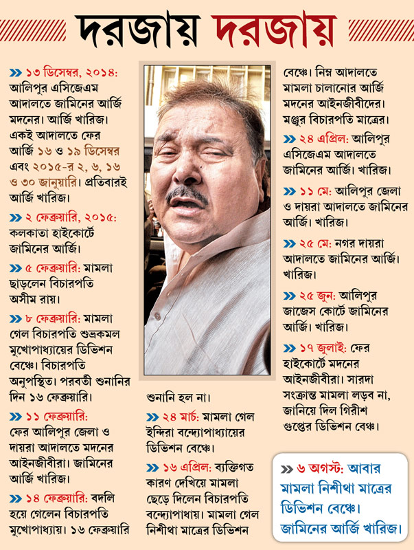 প্রসঙ্গত, গত আট মাসে মদনবাবু একাধিক বার জামিন চেয়েছেন। তবে সে সব মামলা হয়েছে নিম্ন আদালতে। হাইকোর্টে এটাই ছিল তাঁর জামিন-আর্জির প্রথম শুনানি। আগে মদনবাবু হাইকোর্টে জামিনের আবেদন করলেও একাধিক বিচারপতি মামলা শুনতে চাননি। ফলে গত এপ্রিলে তিনি হাইকোর্ট থেকে আর্জি ফিরিয়ে আবার নিম্ন আদালতে যান। কিন্তু গত জুনে আলিপুর কোর্টে আর্জি নাকচের পরে ফের দ্বারস্থ হয়েছিলেন হাইকোর্টের।
