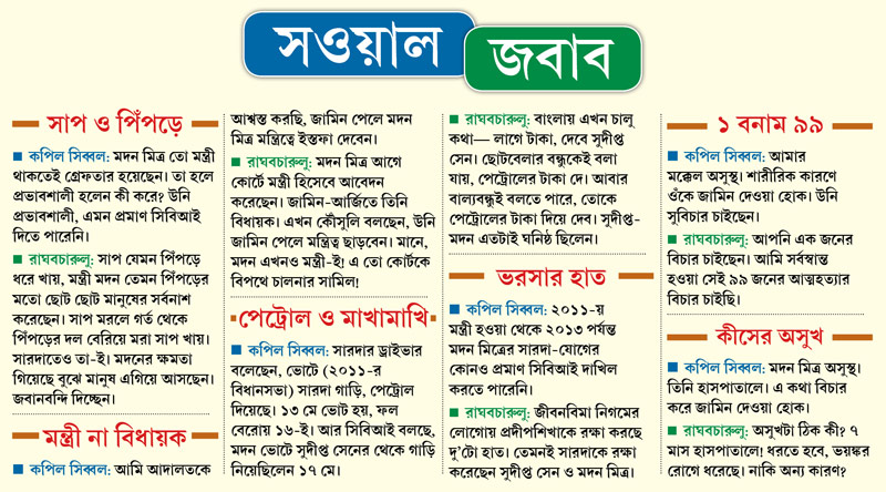 পাল্টা হিসেবে সিব্বল তাঁর মক্কেলের মেডিক্যাল রিপোর্ট পেশ করে দাবি করেন, মদনবাবু যথেষ্ট অসুস্থ। ‘‘না হলে সিবিআই কেন ওঁকে জেলে ফেরতের আর্জি জানাচ্ছে না?’’— প্রশ্ন ছুড়ে দেন মদনবাবুর কৌঁসুলি। তাঁর কথায়, ‘‘এর আগে কোর্টে যখন মদন মিত্রের মেডিক্যাল রিপোর্ট পেশ করা হয়েছে, তখনও তো সিবিআই প্রতিবাদ করেনি!’’