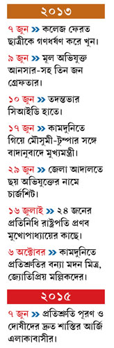 হতাশার সুর চাপা থাকে না তাঁর গলায়। চাকরি-ক্ষতিপূরণের প্রলেপ ভুলিয়ে দেয় না মেয়ে হারানোর জ্বালা। দ্রুত বিচারের আশ্বাস পূরণ হয়নি যে! এখনও শেষ হয়নি সাক্ষ্যগ্রহণ পর্ব। ছাত্রীর ভাই বলছিলেন, ‘‘আমার মা-বাবা রোজ এখনও কাঁদেন। দোষীদের শাস্তির অপেক্ষায় কাঁদতে কাঁদতে মা-বাবা হয়তো মারাই যাবেন।’’ শান্তিরক্ষা কমিটির সদস্যেরা যথারীতি মিছিল করেন, বেদীতে মালা দেন। কিন্তু হতাশা কি গ্রাস করেনি তাঁদেরও? কমিটির সম্পাদক সোনা ঘোষের কথায় কিন্তু তেমনই ইঙ্গিত। বললেন, ‘‘প্রতিশ্রুতি অনুযায়ী কাজ তো হয়নি। এ রকম চললে আমাদেরও অন্য কিছু ভাবতে হবে।’’