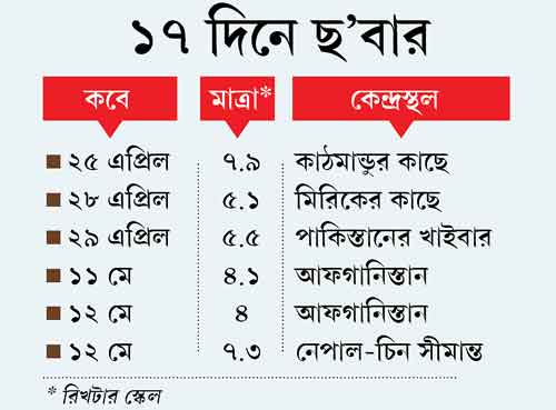 মঙ্গলবার দুপুরে ভূকম্পের সময় শিলিগুড়ি কলেজে রাষ্ট্রবিজ্ঞানের পার্ট ওয়ানের পরীক্ষা চলছিল। ফের ভূমিকম্প হচ্ছে বুঝতে পেরেই হুড়োহুড়ি করে কলেজ থেকে বেরিয়ে পড়েন পরীক্ষার্থীরা। ভূকম্পের রেশ কেটে গেলেও আবার পরীক্ষার হলে যেতে সাহস পাননি অনেকে। তাই কলেজ কর্তৃপক্ষ সামনের মাঠেই পরীক্ষার ব্যবস্থা করেন। কলেজের ভারপ্রাপ্ত অধ্যক্ষ উজ্জ্বল সরকার বলেন, ‘‘এই গরমেও ছাত্রছাত্রীরা মাঠেই থাকতে চাইছিল। কলেজ ভবনটিও পুরনো। তাই শুধু ওই পরীক্ষাটি নয়, পরের অন্য পরীক্ষাগুলোও মাঠেই নেওয়া হয়েছে।’’ পরীক্ষার্থী শ্রেয়া ঘোষ বলেন, ‘‘২৫ এপ্রিল ভূমিকম্পের পরে বেশ কয়েকবার মাটি কেঁপে উঠেছিল। এ বারও তাই হবে বলে আশঙ্কা ছিল। সে কারণেই আমরা আর কলেজে ফিরতে চাইনি।’’