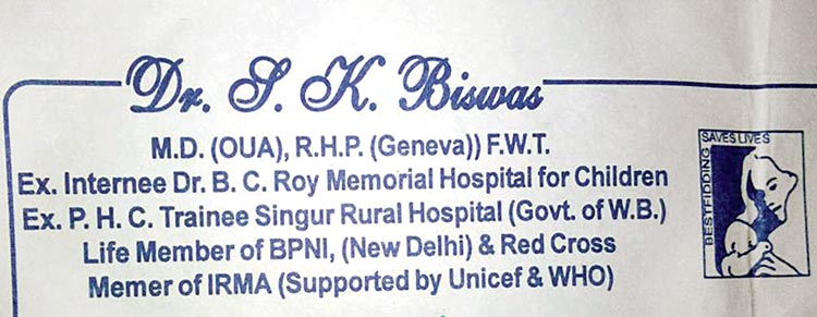 তিনি স্বপনকুমার বিশ্বাস। তাঁর প্রেসক্রিপশনে তেমনই লেখা। ঘোলারবোর্ডঘরে বড় রাস্তার পাশে সাজানো চেম্বার। এলাকায় শিশু চিকিৎসক হিসেবেই পরিচিত তিনি। কোনও বৈধ রেজিস্ট্রেশন নম্বর না থাকলেও রোগী দেখছেন। শিশুদের টিকাও দিচ্ছেন।