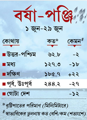 গত এপ্রিলে মৌসম ভবন দেশে স্বাভাবিকের চেয়ে বেশি বর্ষার পূর্বাভাস দিয়েছিল। বস্তুত জুনের শেষে অনেক রাজ্যে তারই প্রতিফলন। রাজস্থানের মরু এলাকা তো বটেই, বিদর্ভ-ছত্তীসগঢ়ের ‘শুখা’মাটিও স্বাভাবিক বর্ষণে স্নিগ্ধ। পশ্চিম ও মধ্য ভারতে জুলাইয়েও ভাল বৃষ্টির আশা। পূর্বাঞ্চলের কপাল মন্দ কেন?