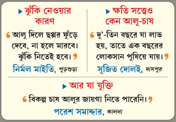 চাষিদের সঙ্গে কথা বলে দেখা গেল, এ হল ফাটকা খেলার ঝোঁক। হুগলির পুড়শুড়ার জঙ্গলপাড়ার নির্মল মাইতি বললেন, “আমরা জানি, আলু দিলে ছপ্পর ফুঁড়ে দেবে, না হলে মারবে। তাই ঝুঁকি তো নিতেই হবে।” বর্ধমানের কালনা ২ ব্লকের আলুচাষি তপন ঘোষের কথায়, “আলুর বাজার অনেকটাই ফাটকা। বহু বার অন্য রাজ্যে বিপর্যয়ের কারণে এ রাজ্যে দাম বেড়ে গিয়েছে। তখন ভাল দাম মিলেছে।” তা ছাড়া, এক বছরের লোকসান পুষিয়ে গিয়েও লাভ থাকে অন্য বছরে। পশ্চিম মেদিনীপুরের দাসপুর ১ ব্লকের সুজিত দোলই, গোষ্ঠবিহারী মূলাদের বক্তব্য, “দু-তিন বছরে যা লাভ হয়, তাতে এক বছরের লোকসান পুষিয়ে যায়। তাই সব জেনেও আলু চাষ ছাড়তে পারি না।”