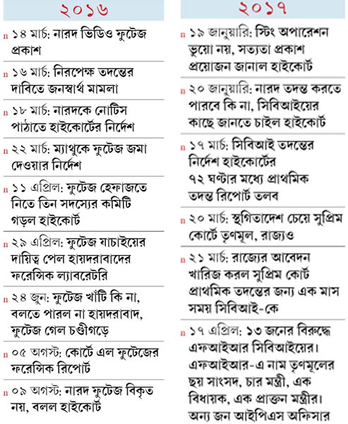 ২০১৪-এর মার্চে কলকাতা এসে অভিযুক্তদের সঙ্গে দেখা করেন নারদ নিউজের কর্ণধার ম্যাথু স্যামুয়েল। এ রাজ্যে ব্যবসা করার অছিলায় তাঁদের সঙ্গে আলাপ জমান এবং টাকা দেন। সেই দৃশ্য তুলে রাখেন গোপন ক্যামেরায়। তাঁর সেই ভিডিও প্রকাশিত হয় ২০১৬-এর ১৪ মার্চ। জনস্বার্থে মামলা হয় হাইকোর্টে। ভিডিও ফুটেজ পাঠানো হয় ফরেন্সিক পরীক্ষার জন্য। প্রাথমিক তদন্তের জন্য এ বছর ১৭ মার্চ সিবিআই-কে নির্দেশ দেয় হাইকোর্ট। ৭২ ঘণ্টার মধ্যে ওই তদন্ত শেষ করতে বলা হয়। এই রায়ের বিরুদ্ধে সুপ্রিম কোর্টে যায় রাজ্য। সুপ্রিম কোর্ট হাইকোর্টের নির্দেশই বহাল রাখে। তবে, প্রাথমিক তদন্তের সময় বাড়িয়ে এক মাস করে দেয়। সিবিআই অবশ্য হাইকোর্টের দেওয়া নির্দেশের দিন থেকেই এক মাস সময়সীমা হিসেব করেছে।