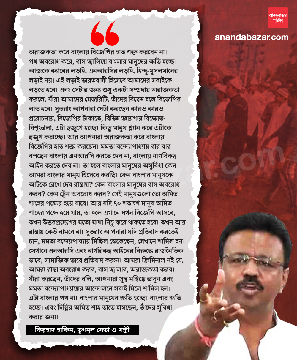 ফিরহাদ এনআরসি এবং নাগরিকত্ব আইনের বিরুদ্ধে রাজনৈতিক ভাবে, সামাজিক ভাবে প্রতিবাদ করার কথাও এ দিন বলেছেন। তাঁর কথায়, ‘‘আমরা ক্রিমিনাল নই যে, রাস্তা অবরোধ করব। বাস জ্বালাব। অরাজকতা করব। যাঁরা করছেন, তাঁরা সুস্থ মস্তিষ্কে ভাবুন এবং মমতা বন্দ্যোপাধ্যায়ের আন্দোলনে সবাই মিলে শামিল হন। এটা বাংলার পথ না। বাংলার মানুষের ক্ষতি হচ্ছে। বাংলার ক্ষতি হচ্ছে। এবং দিল্লির অমিত শাহ তাতে হাসছেন, তাঁদের সুবিধা করার জন্য।’’