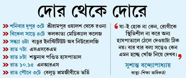 এক মাস আগে কেশপুরে বাস দুর্ঘটনায় গুরুতর জখম এক উচ্চ মাধ্যমিক পরীক্ষার্থীকে ফিরিয়ে দিয়েছিল কলকাতার তিন সরকারি হাসপাতাল। শনিবার তার চেয়েও বেশি ভুগতে হল শ্রীরামপুরের সঞ্জয় প্রামাণিককে। একটি আবাসনের তিন তলা থেকে পড়ে শিরদাঁড়া ও হাতে গুরুতর চোট পাওয়া সঞ্জয়কে রাতভর ঘুরতে হল কলকাতার পাঁচ হাসপাতালে। কোথাও জায়গা না পেয়ে প্রায় ভোররাতে তাঁর ঠাঁই হল বেলুড় শ্রমজীবী হাসপাতালে।