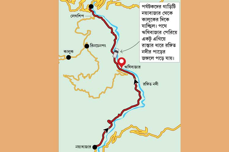 দেগঙ্গার শান্তিনিকেতন ইনস্টিটিউটের শিক্ষক তুষারকান্তি শিলিগুড়ি জেলা হাসপাতালে চিকিৎসাধীন। তুষারকান্তি জানান, দু’টো গাড়িতে মোট ১৭ জন ছিলেন। নামচির কিছু জায়গা ঘুরে সন্ধ্যার পরে তাঁরা কালুকের হোটেলের দিকে ফিরছিলেন। একটি গাড়ি কালুকে পৌঁছোয়। অন্য গাড়িটিতে ছিলেন তুষারকান্তিবাবুরা। তিনি বলেন, ‘‘আমি গাড়ির পিছন দিকে ছিলাম। আমার স্ত্রী সামনের দিকে এবং বাকিরা মাঝখানের সিটে বসেছিলেন। মাঝপথে হঠাৎ একটা প্রবল ঝাঁকুনিতে ঘুমের ঘোর কেটে যায়। আমাদের গাড়িটা গড়াতে গড়াতে নীচে নামছিল। সবাই চিৎকার জুড়ে দেন। কী করব বুঝে উঠতে পারছিলাম না।’’ নীচে তখন অন্ধকার নেমে এসেছে। তিনি বলেন, ‘‘আমাদের গাড়িটা কয়েকবার উল্টেপাল্টে একটি বাঁশঝাড়ে গিয়ে আটকায়। তখনই পিছন দিকের দরজার কাচ ভেঙে আমি বাইরে পড়ে গিয়ে বাঁশঝাড়ে আটকে যাই। মিনিট তিরিশেক পরে স্থানীয় বাসিন্দারা আমাদের উদ্ধার করেন।’’ স্থানীয় বাসিন্দারাই তাঁদের কাছাকাছি একটি হাসপাতালে নিয়ে যান। পরে সিকিম পুলিশ দেহগুলিকে গ্যালসিং হাসপাতালে পাঠায়। আহত দু’জনকে শিলিগুড়ি জেলা হাসপাতালে নামিয়ে আনা হয়। বাকি ৯ জন সারা দিন গ্যালসিং এলাকাতেই ছিলেন।