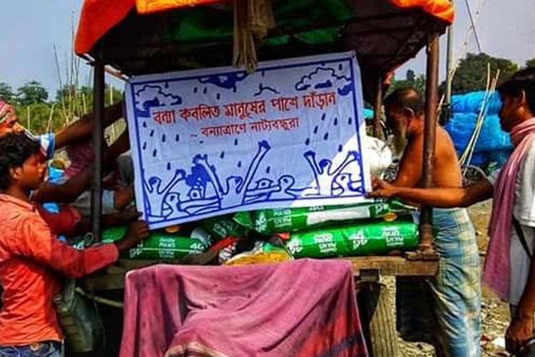 উদ্যোগের নাম ‘বন্যাত্রাণে নাট্যবন্ধুরা’। শামিল হলেন ‘হাওড়া নির্ণয়’, ‘হাওড়া জোনাকি’, ‘পূর্ব কলকাতা বিদূষক’, ‘যাদবপুর আনকার্টেইন্ড’, ‘কাঁকিনাড়া শিল্পাঙ্গন’, ‘আমাদপুর সম্প্রীতি’, ‘আরামবাগ নাট্য অ্যাকাডেমি’র মতো দলের কর্মীরা। তাঁদের সঙ্গেই অংশ নিয়েছিলেন এমন অনেকে, যাঁরা একাধিক নাট্যদলে কাজ করেন। ছিলেনমানবাধিকার নিয়ে কাজ করা কয়েক জন। গান বেঁধে, সুর করে, সেই গান গেয়ে পুজোর সময় কলকাতা ও শহরতলির প্যান্ডেলে-পথে-বাজারে কৌটো ঝাঁকিয়ে, কাপড় বিছিয়ে চাঁদা তুলেছিলেন তাঁরা। সোশ্যাল মিডিয়াতেও সাহায্যের আবেদন জানানো হয়। অনলাইনেও চাঁদা দেন বহু মানুষ। চাঁদার টাকায় ত্রাণসামগ্রী কেনা হয় বলে ‘বন্যাত্রাণে নাট্যবন্ধুরা’-র তরফে জানানো হয়েছে।