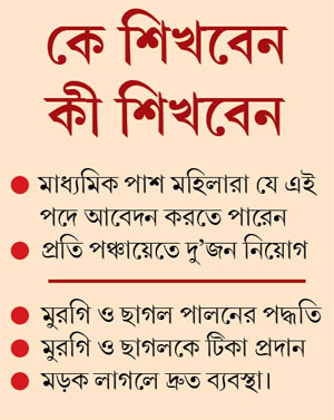 মাধ্যমিক পাশ হলেই যে কোনও মহিলা যে এই পদে আবেদন করতে পারেন। করেছেনও তাই। যদিও এই কাজে তাঁদের অভিজ্ঞতা নেই। প্রাণী সম্পদ বিকাশ বিভাগের ডেপুটি ডিরেক্টর তপন সাধুখাঁ বলেন, “প্রার্থী বাছাইয়ের পর প্রত্যেক প্রার্থীকেই প্রশিক্ষণ দেওয়া হবে। ভ্যাকসিন দেওয়ার পাশাপাশি কোন রোগের লক্ষণ কী, কী ভাবে চিকিত্সা করা হবে, এ সব বোঝানো হবে প্রশিক্ষণে।” কিছু বিষয়ে প্রশিক্ষণ দিয়েই নিয়োগ করা হবে এই কর্মীদের।