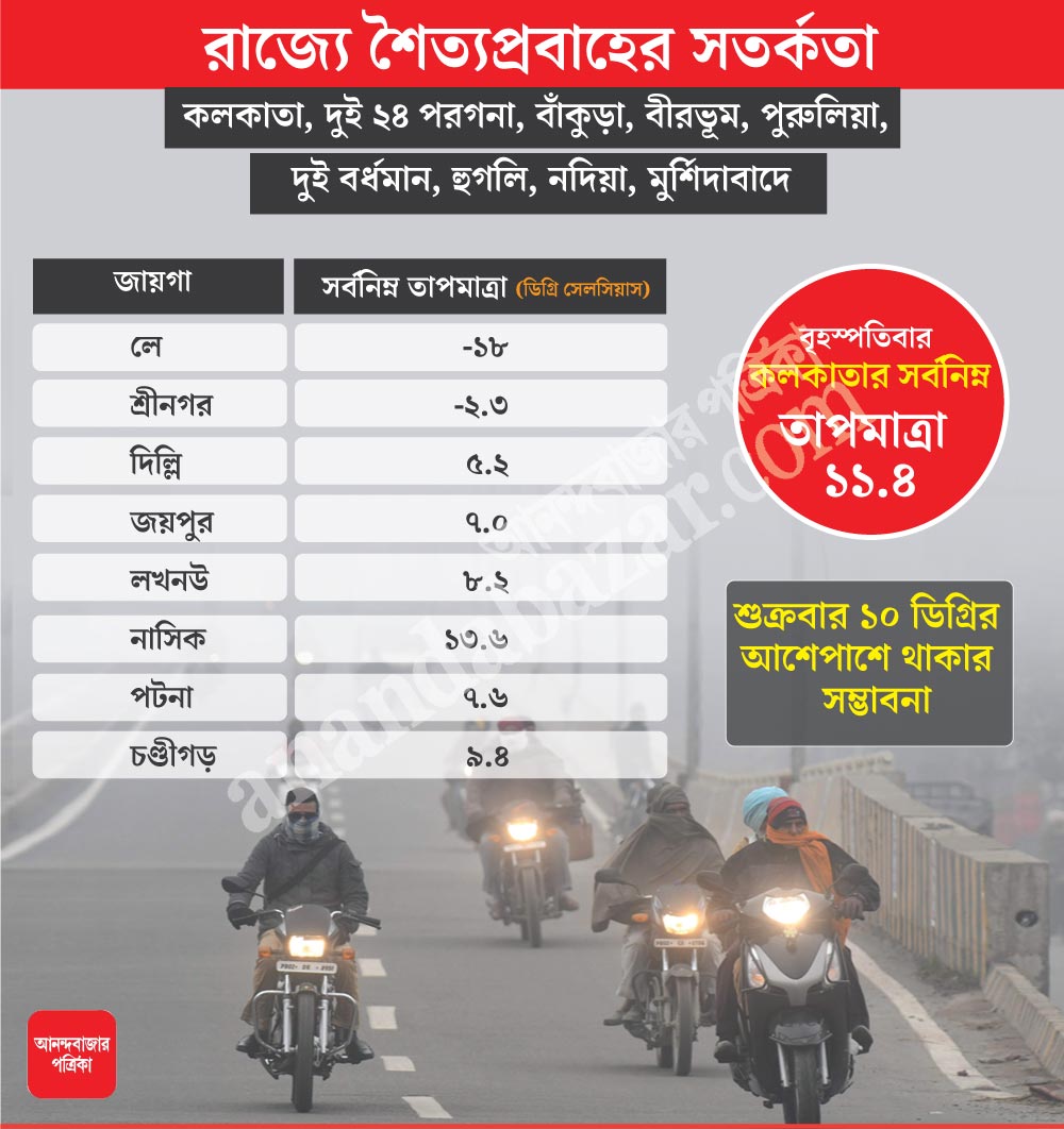 বৃহস্পতিবার কলকাতার সর্বনিম্ন তাপমাত্রা নেমে দাঁড়িয়েছে ১১.৪ ডিগ্রি সেলসিয়াসে। শৈত্যপ্রবাহের কারণে তাপমাত্রা ১০ ডিগ্রির ঘরে চলে যেতে পারে বলে জানিয়েছেন আলিপুর আবহাওয়া দফতরের অধিকর্তা গণেশপ্রসাদ দাস। তিনি বলেন, “শৈত্যপ্রবাহের সতর্কতা রয়েছে। আগামী কয়েক দিন কনকনে ঠান্ডা থাকবে রাজ্য জুড়ে।”