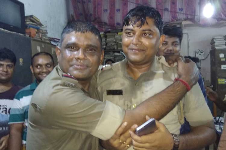 মহিষাদল থানার ওসি পার্থ বিশ্বাস (বাঁ দিকে) ও কাঁথি থানার এএসআই প্রবীর সাহা। —নিজস্ব চিত্র।