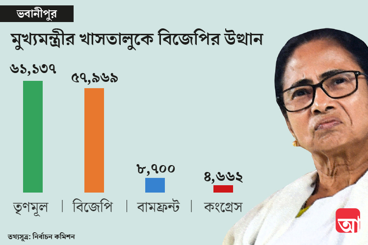 রাজ্যে গেরুয়া ঝড়ের দাপট থেকে রেহাই পায়নি খোদ মুখ্যমন্ত্রীর খাসতালুক ভবানীপুরও। বিধানসভা নির্বাচনে এই কেন্দ্র থেকে জিতেই মুখ্যমন্ত্রী হয়েছিলেন তিনি। সেই নির্বাচনে পঁচিশ হাজারেরও বেশি ভোটে জিতে বিধায়ক হয়েছিলেন তিনি। সেই ভবানীপুরেও মমতা বন্দ্যোপাধ্যায়ের ঠিক পিছনেই এখন বিজেপি। লোকসভা নির্বাচনের নিরিখে এই বিধানসভা আসনে তৃণমূল পেয়েছে ৬১ হাজার ১৩৭টি ভোট। সেখানে বিজেপি পেয়েছে ৫৭ হাজার ৯৬৯টি ভোট। অর্থাৎ, নিজের কেন্দ্রেও কোনও রকমে তিন হাজার ১৬৮ ভোটের নামমাত্র ব্যবধানে এগিয়ে তৃণমূলনেত্রী।