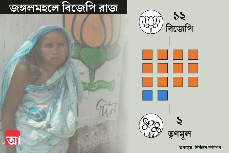 একই অবস্থা জঙ্গলমহলেও। ঝাড়গ্রাম, পশ্চিম মেদিনীপুর, বাঁকুড়া আর পুরুলিয়া মিলিয়ে জঙ্গলমহলের মোট ১৪টি বিধানসভা আসনের মধ্যে ১২টিতেই এগিয়ে বিজেপি। কোনও রকমে দু’টি আসনে লিড ধরে রেখে নিজেদের অস্তিত্ব বজায় রেখেছে তৃণমূল। সদ্যসমাপ্ত লোকসভা নির্বাচনের নিরিখে জঙ্গলমহলের নয়াগ্রাম, গোপীবল্লভপুর, ঝাড়গ্রাম, গড়বেতা, মেদিনীপুর, বান্দোয়ান, বলরামপুর, বাঘমুন্ডি, জয়পুর, পুরুলিয়া, রানিবাঁধ, রাইপুরে এগিয়ে বিজেপি। অন্য দিকে তৃণমূল এগিয়ে শুধু মানবাজার আর বিনপুরে।