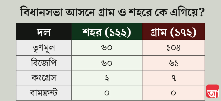 গ্রামাঞ্চলের বিধানসভা আসনে তৃণমূলের ঘাড়ে কার্যত নিশ্বাস ফেলছে পদ্মশিবির। সেখানে কংগ্রেসকে প্রায় দূরবীন দিয়ে খুঁজতে হচ্ছে। আর বামেদের ঝুলিতে আসনের সংখ্যা শূন্য! পরিসংখ্যান বলছে, তারা একটি আসনেও এগিয়ে নেই।