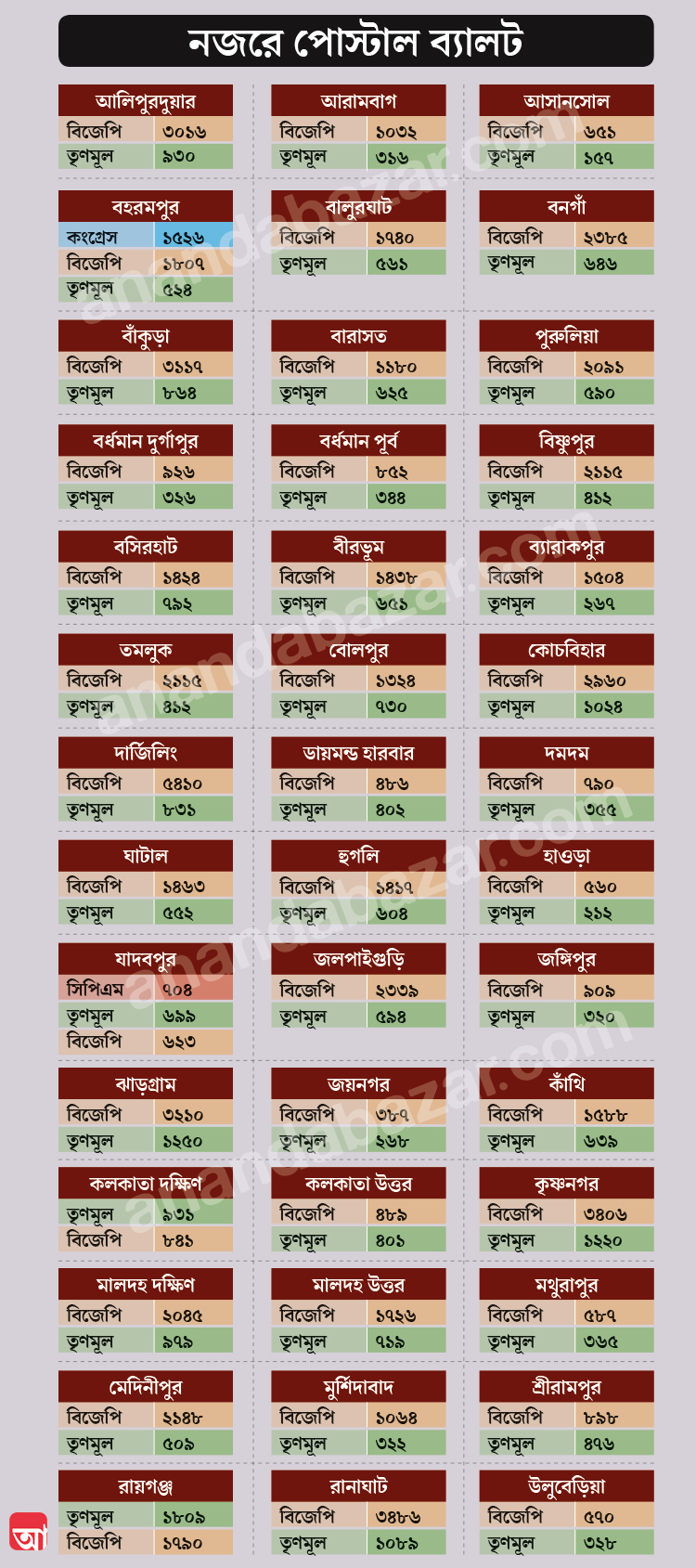 পোস্টাল ব্যালটের হিসেবে রাজ্যের ৪২টি আসনের মধ্যে ৩৯টিতেই এগিয়ে বিজেপি। একটি করে কেন্দ্রে জয়ী তৃণমূল, সিপিএম এবং কংগ্রেস। দক্ষিণ কলকাতায় তৃণমূলের মালা রায়, মুর্শিদাবাদে অধীর চৌধুরী এবং যাদবপুরের বাম প্রার্থী বিকাশরঞ্জন ভট্টাচার্য জিতেছেন। পোস্টাল ব্যালটে সরকারি কর্মীরা একচেটিয়া ভাবে তৃণমূলের বিরুদ্ধে ভোট দিয়েছেন বলেই মনে করছেন রাজনৈতিক পর্যবেক্ষকরা। পাশাপাশি ভোটের পর থেকেই সোশ্যাল মিডিয়ায় ফের শুরু হয়েছে এই নিয়ে নানা পোস্ট, মিম, ভিডিয়ো।