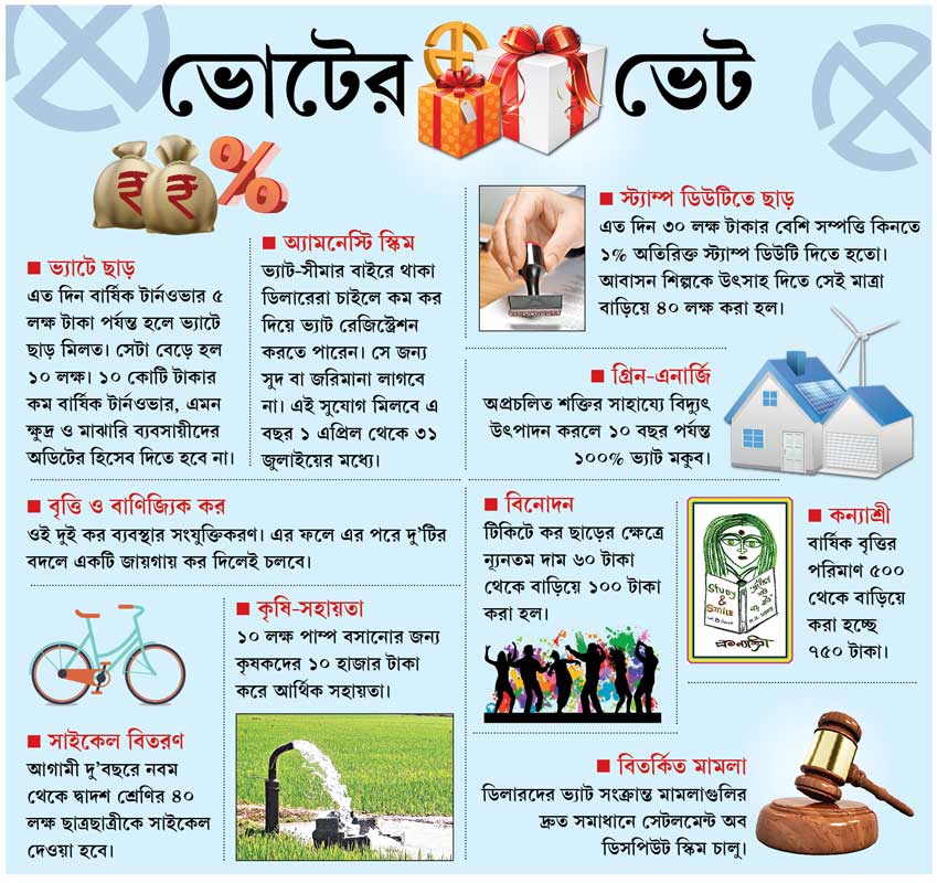 ভোটের কথা মাথায় রেখেই ফলাও করে বাজেটে ঘোষণা করা হয়েছে অসংগঠিত শ্রমিকদের জন্য ‘সামাজিক মুক্তি কার্ড’, পরিবহণ কর্মীদের জন্য সামাজিক সুরক্ষা প্যাকেজের কথা। রয়েছে চা-শ্রমিক এবং চা-বাগানের জন্যও একাধিক কর ছাড়ের প্রস্তাব।