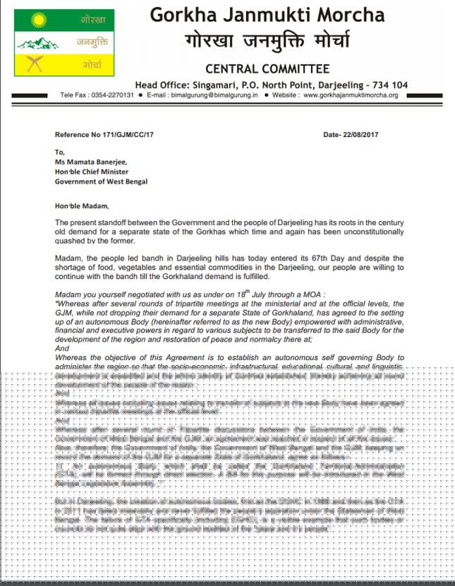 চিঠিতে গুরুঙ্গ লিখেছেন, জিটিএ চুক্তি অনুযায়ী পৃথক রাজ্যের দাবিতে তাঁরা আন্দোলন জারি রাখবেন। গোর্খ্যাল্যান্ড ছাড়া পাহাড়ে সমস্যা সমাধানের আর কোনও রাস্তা নেই এবং শান্তি ফেরাতে গোর্খ্যাল্যান্ড নিয়ে আলোচনা শুরু করুক রাজ্য সরকার, চিঠিতে লিখেছেন মোর্চা সুপ্রিমো।